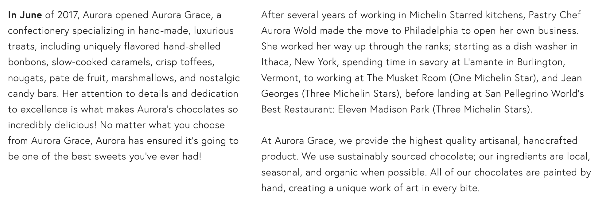 The about page of the Aurora Grace website, written with the intention of capturing the story and heart behind this local Philly dessert shop.