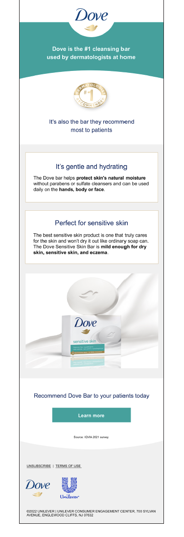 These emails promote Dove Sensitive Skin products to dermatologists, using their #1 prescribed claim and explaining the science behind Dove Body Wash.
